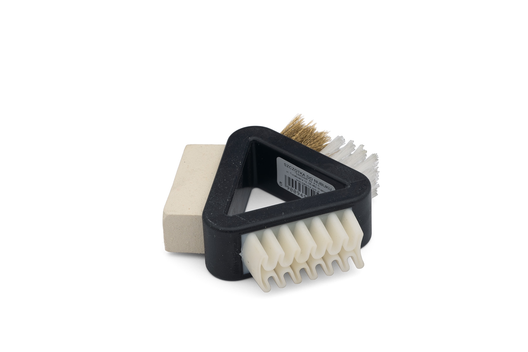 - szczoteczka miedziana wybiera głęboko wtarty brud, a nylonowa rozczesuje strukturę zamszu;