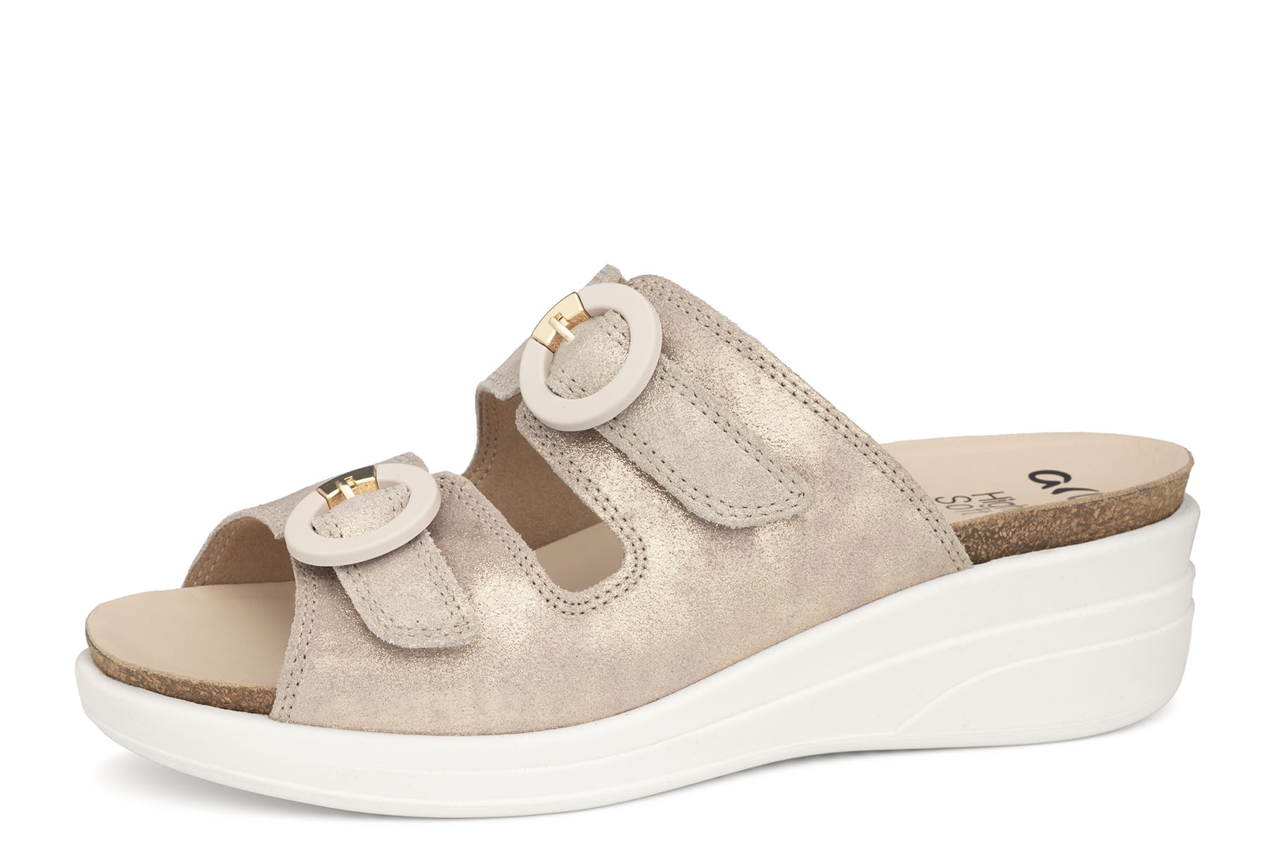 Ara Zurich-S 12-47002 05H High Soft wygodne klapki damskie wykonane ze skóry naturalnej; wyjmowane, amortyzujące wkładki - HighSoft z pelotą na płaskostopie poprzeczne; regulacja paskami na rzep; lekkie, elastyczne, antypoślizgowe podeszwy; tęgość H - na stopy szersze.