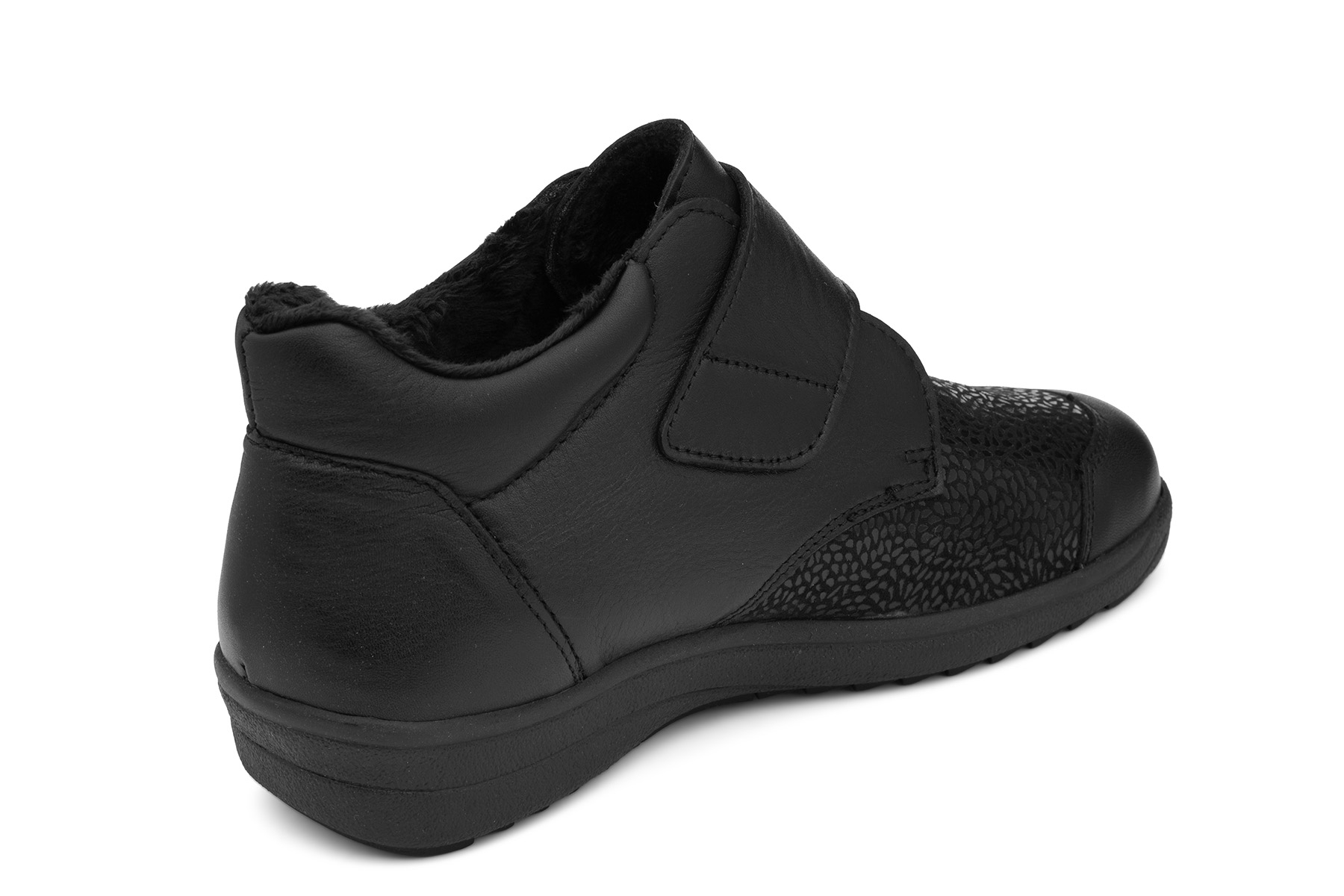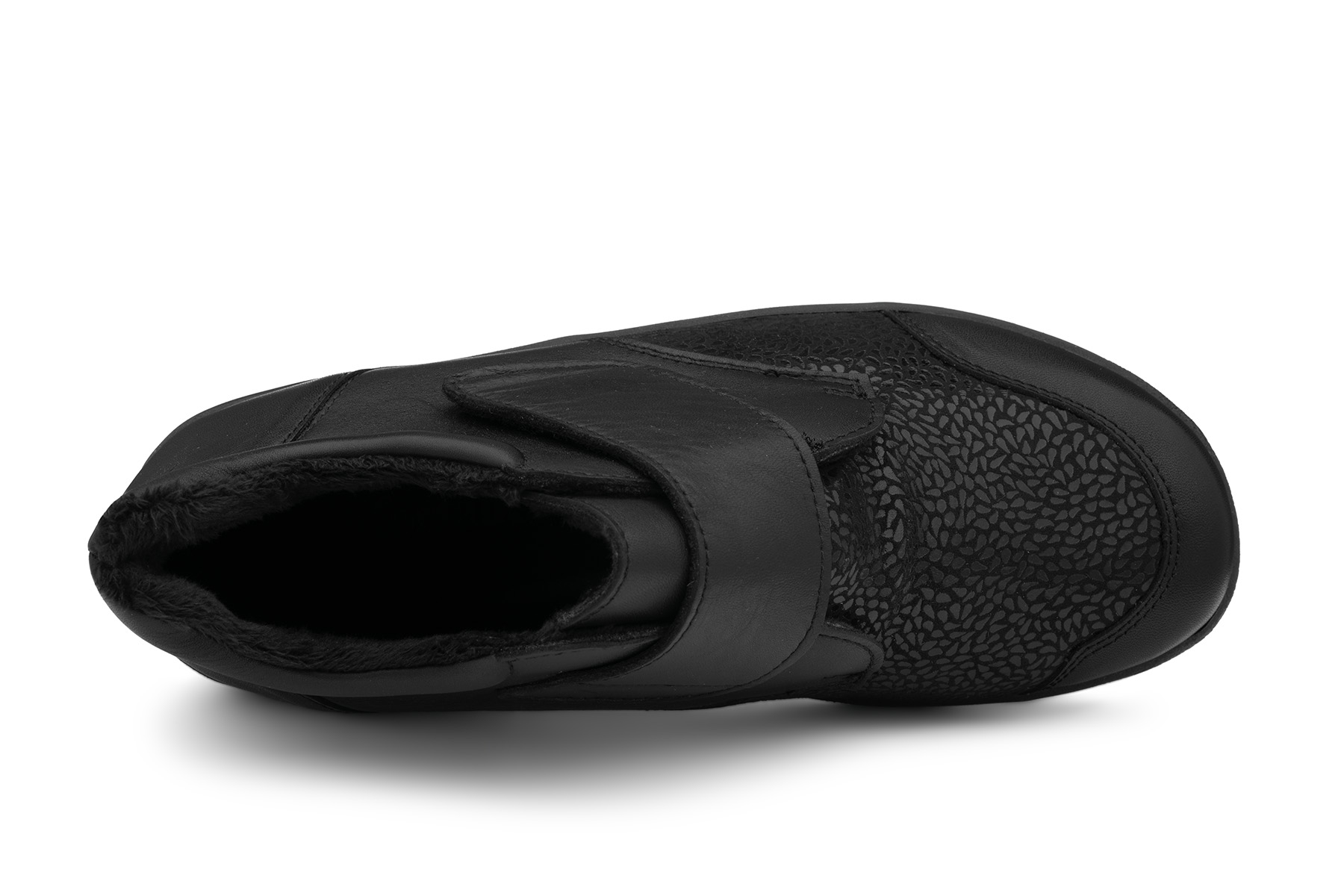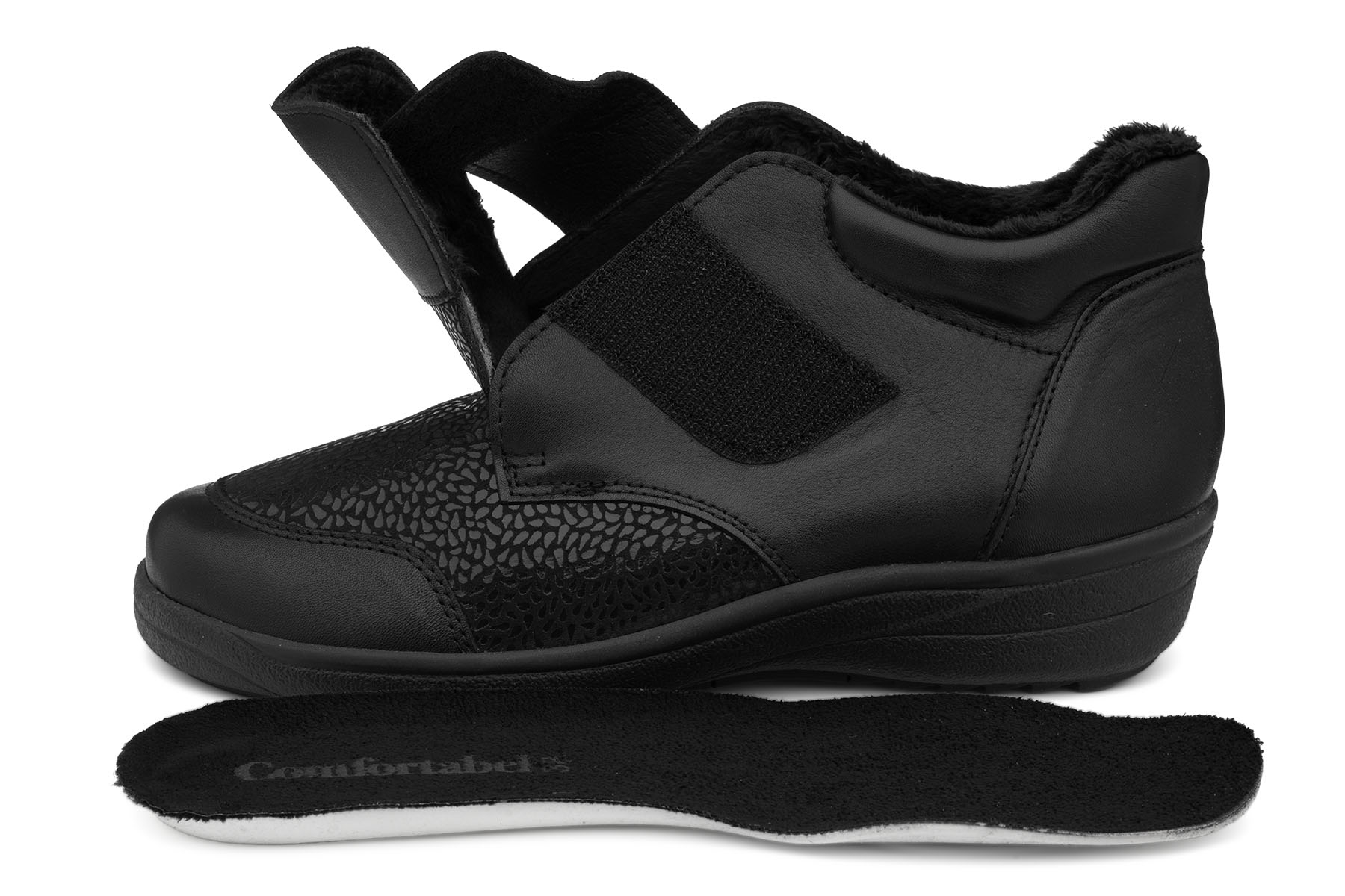 Comfortabel 990542 01 wygodne botki damskie wykonane ze skóry naturalnej - licowej w kolorze czarnym; z przodu elastyczny materiał ułatwiający dopasowanie obuwia do niedoskonałości stopy; regulowane paskiem na rzep; wyjmowane wkładki z przyjemnego mikroweluru; ocieplone futerkiem tekstylnym; elastyczne, antypoślizgowe podeszwy; tęgość K - polecane na stopy szerokie, na przykład z halluksami, stopy cukrzycowe.