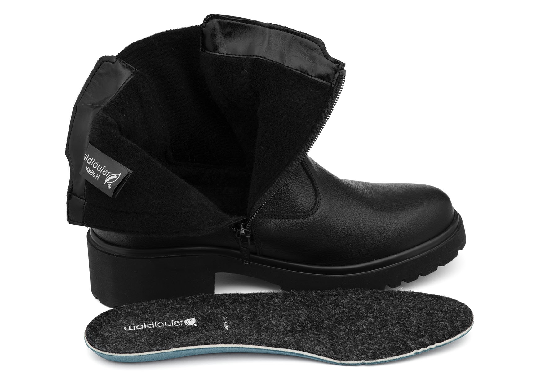 Waldlaufer H-Luise wzór 716815 139 001 wygodne, zdrowotne botki damskie wykonane z miękkiej skóry naturalnej - licowej; wyjmowane filcowe wkładki lekko profilowane na płaskostopie podłużne i poprzeczne; grube, lekkie, antypoślizgowe podeszwy; boczny suwak ułatwiający zakładanie; lekko ocieplone tkaniną wełnianą; tęgość H - polecane na stopy szersze.