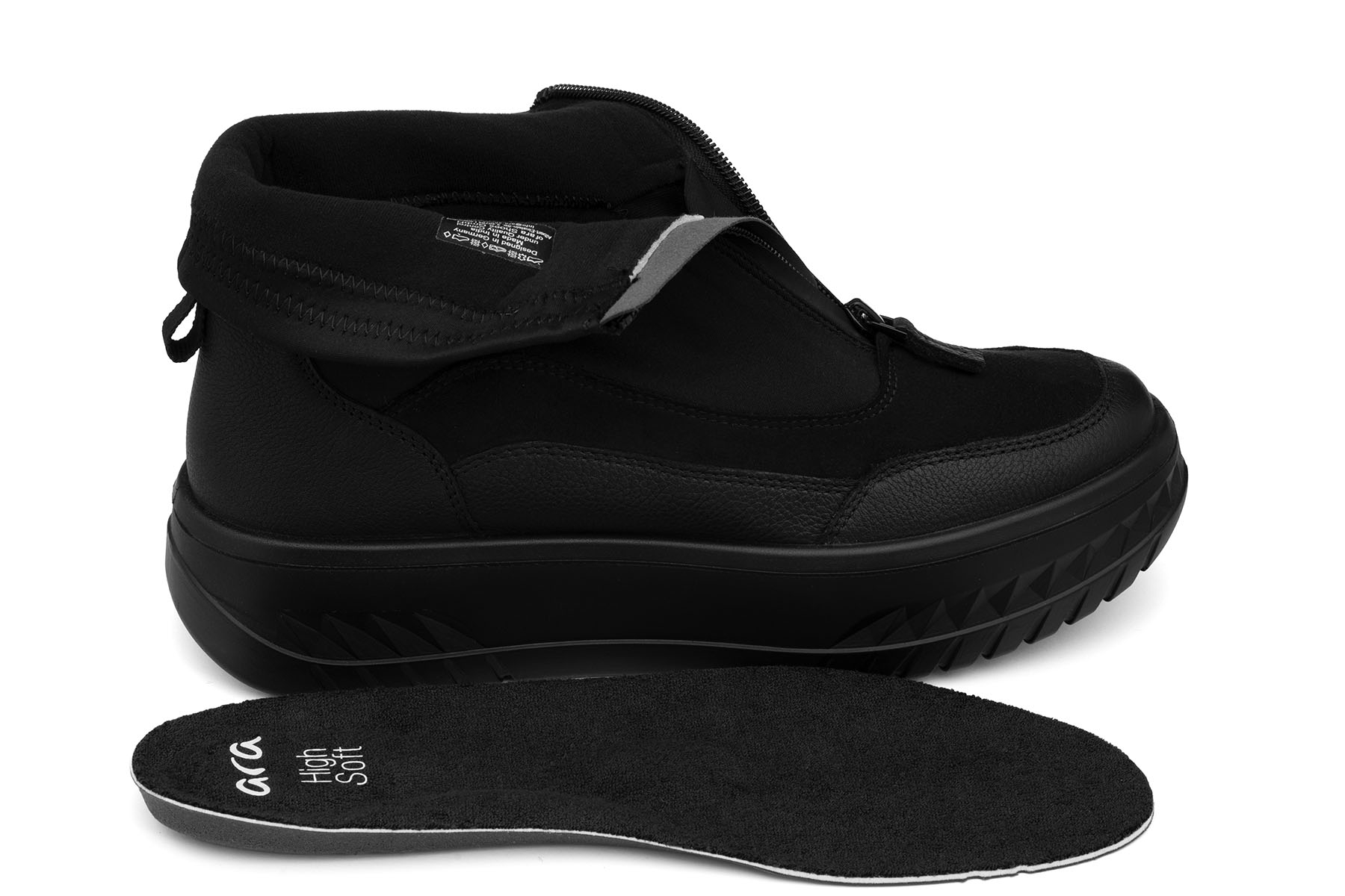 Ara Graz 12-46708 01H High Soft wygodne botki damskie wykonane z połaczenia skóry naturalnej i materiału zabezpieczonego nieprzemakalna membraną Gore-Tex; wyjmowane, amortyzujące wkładki - HighSoft z pelotą na płaskostopie poprzeczne; grube, lekkie, antypoślizgowe podeszwy; suwak ułatwiający zakładanie; tęgość H - polecane na stopy szersze.