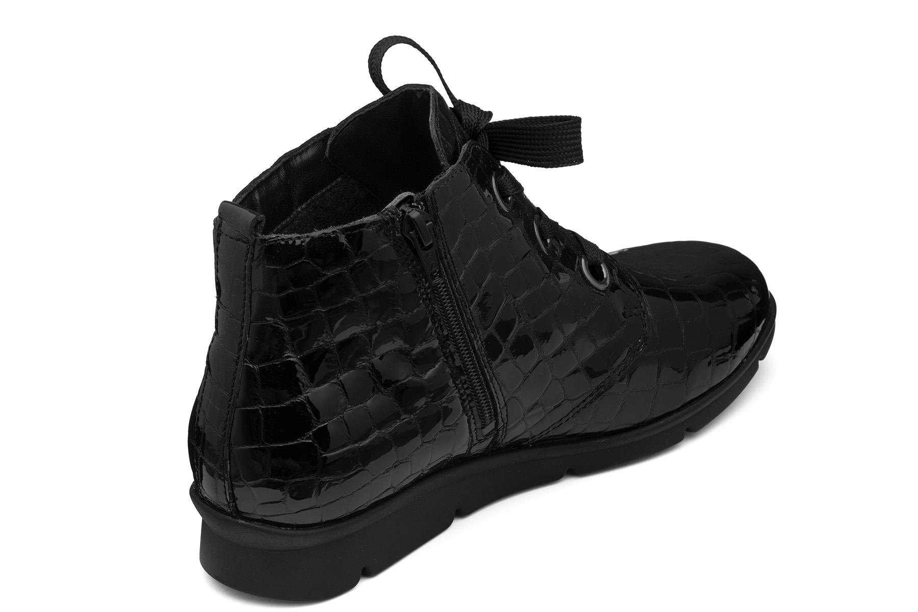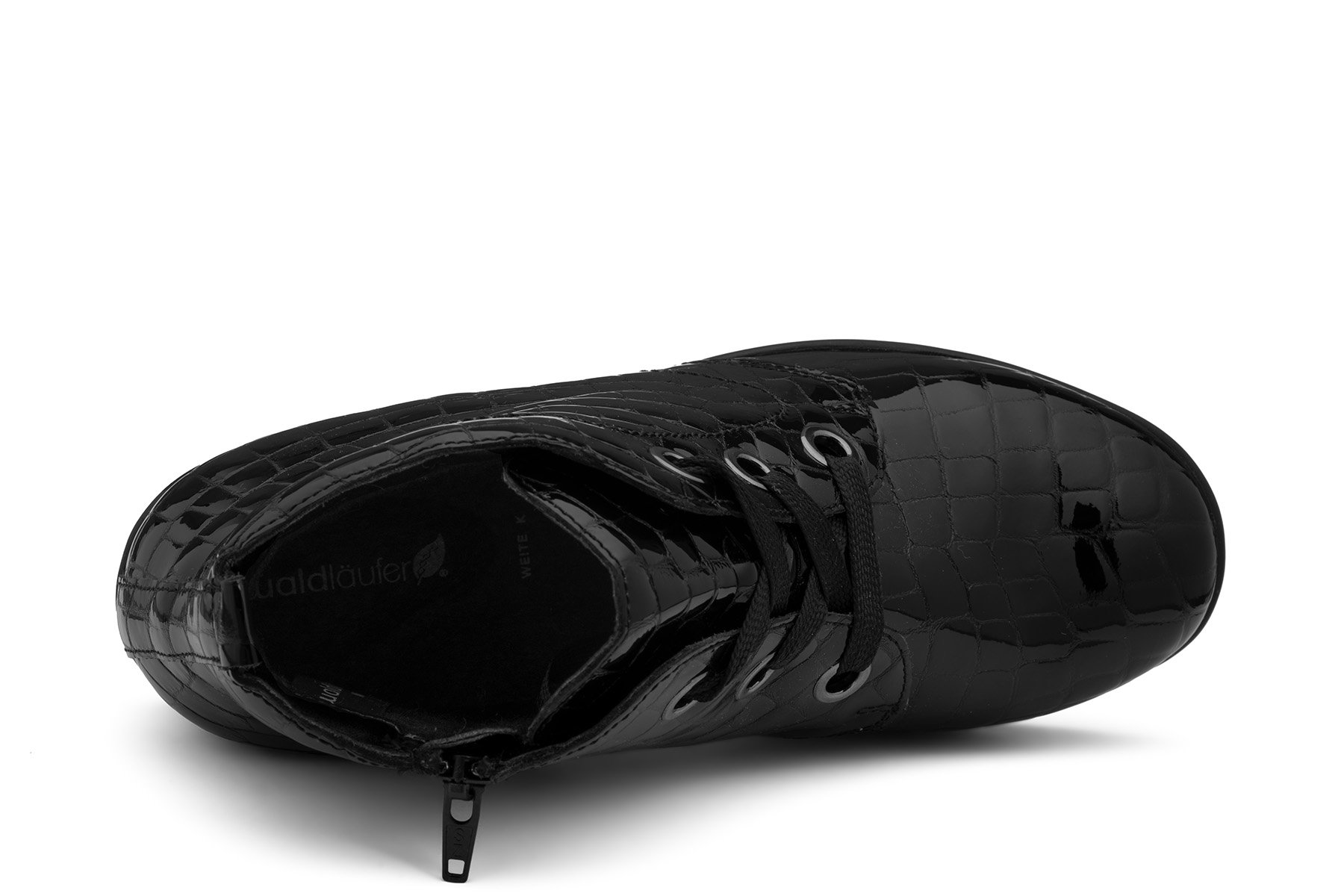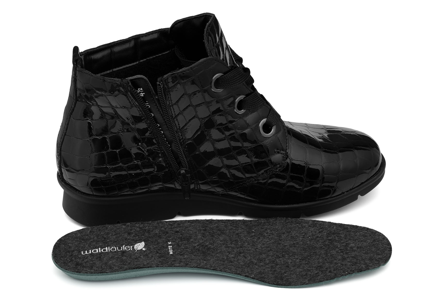 Waldlaufer K-Inga 693801 150 001 wygodne, zdrowotne botki damskie wykonane ze skóry naturalnej - lakierowanej; wyjmowane, filcowe lekko profilowane wkładki; elastyczne, antypoślizgowe podeszwy; boczny suwak ułatwiający zakładanie; lekko ocieplone tkaniną wełnianą; tęgość K - polecane na stopy szerokie.
