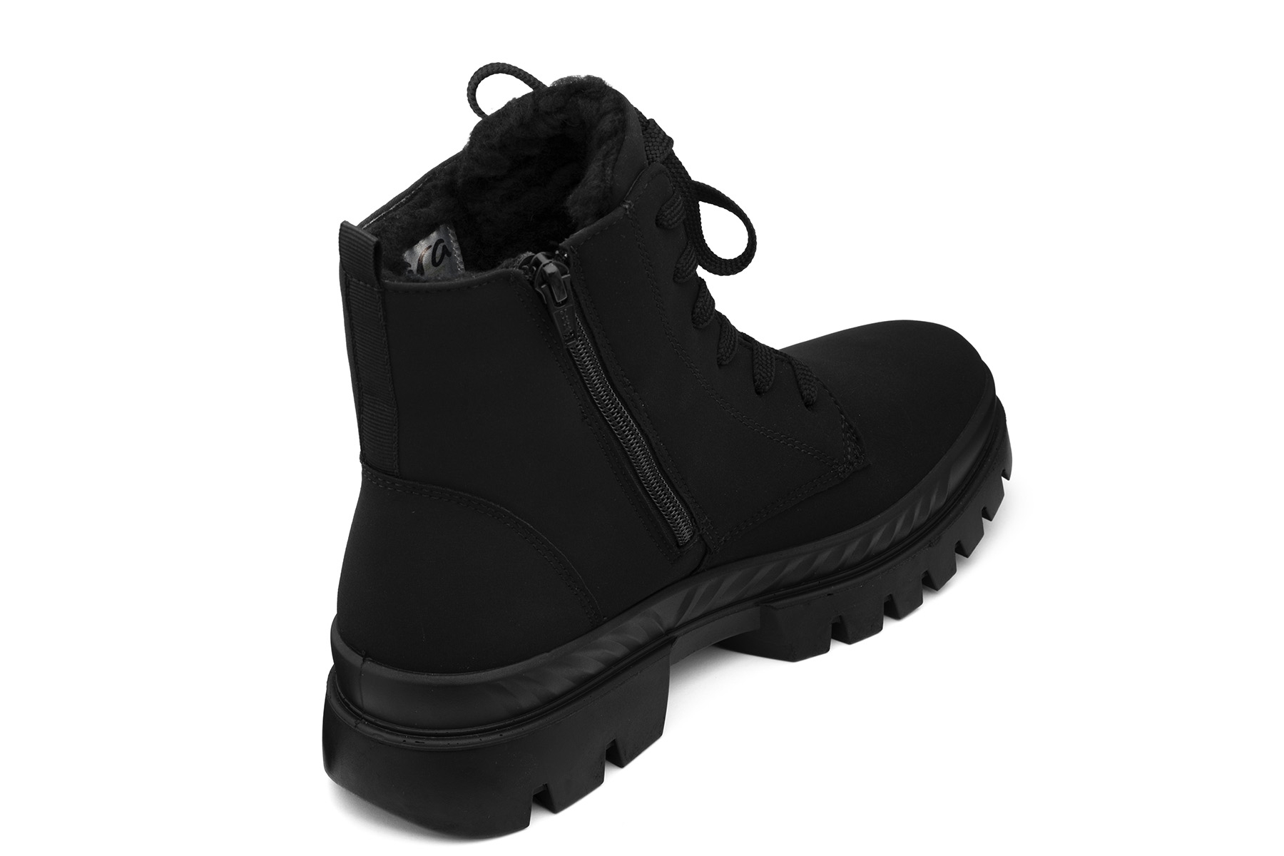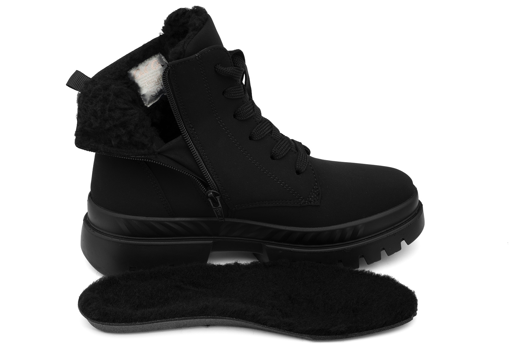 Ara Mood 12 14116 11H High Soft wygodne botki damskie wykonane z materiału zabezpieczonego nieprzemakalna membraną Gore-Tex; wyjmowane, amortyzujące wkładki - HighSoft Bamboo z pelotą na płaskostopie poprzeczne; grube, elastyczne, antypoślizgowe podeszwy; dobrze ocieplone tkaniną Bamboo ; suwak ułatwiający zakładanie; tęgość H - polecane na stopy szersze.