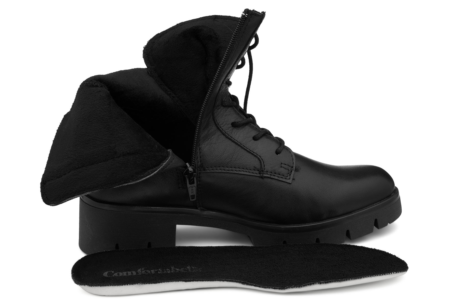 Comfortabel 960456 01 wygodne damskie botki wykonane ze skóry naturalnej - licowej; wyjmowane wkładki - można je zastąpić własnymi na przykład ortopedycznymi; boczny suwak ułatwiający zakładanie; lekko ocieplone futerkiem; grubsze,  elastyczne, antypoślizgowe podeszwy; tęgość H.