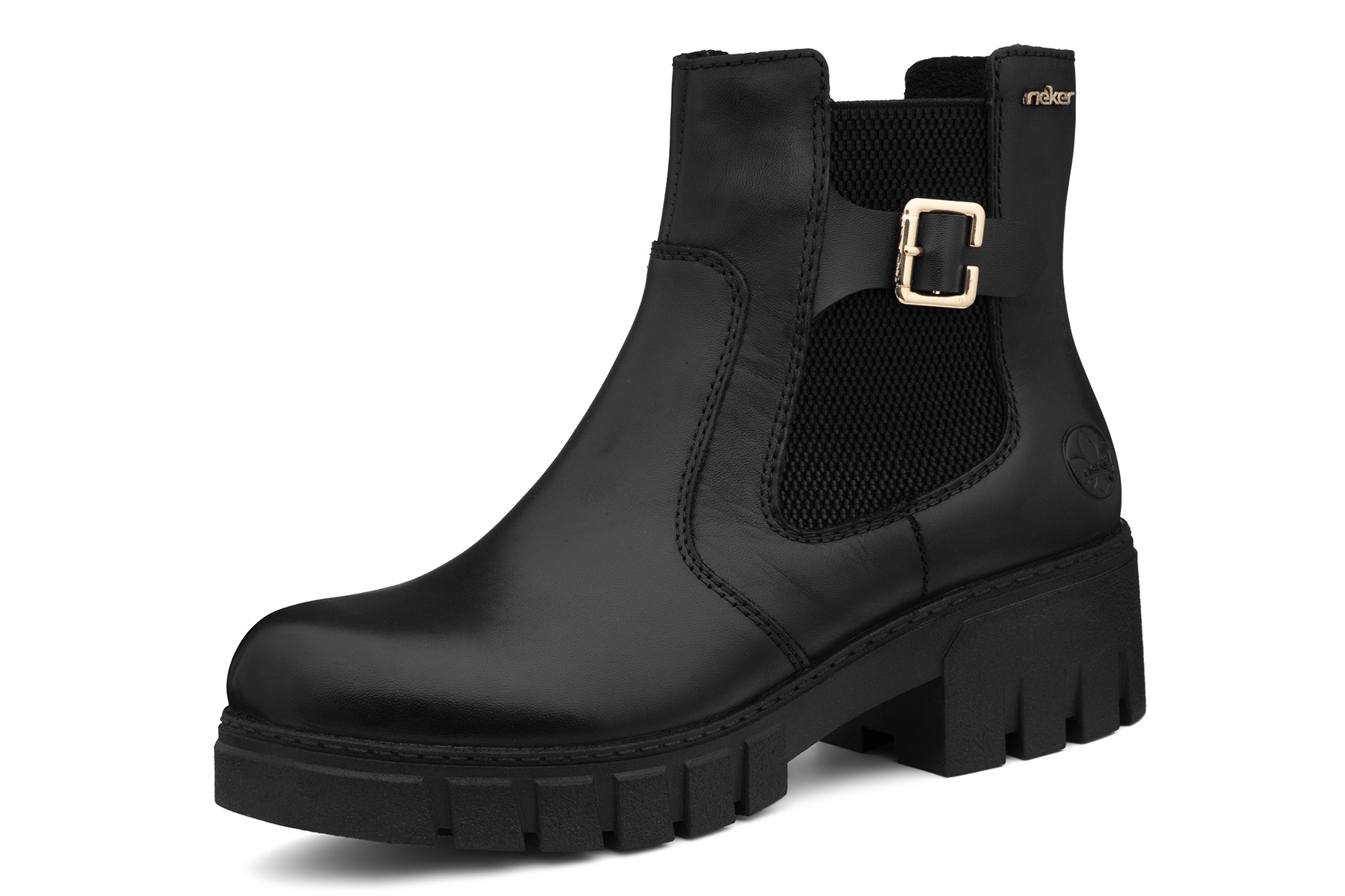 Rieker wzór 74560-00 wygodne botki damskie wykonane ze skóry naturalnej - licowej; miękkie filcowe wkładki; grube, antypoślizgowe podeszwy; stabilne obcasy; ocieplone wełną; boczny suwak ułatwiający zakładanie.