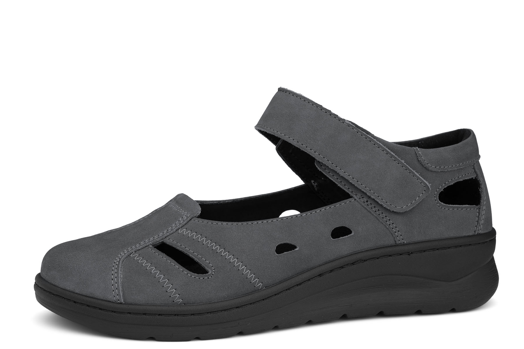 Bailar Pilar wygodne półbuty damskie wykonane ze skóry naturalnej - nubuk w kolorze szarym ; profilowane, amortyzujące wkładki z pianki pokryte tkaniną; elastyczne, antypoślizgowe podeszwy; tęgość K - stopy szerokie. Mogą być również na tęgość H dzięki regulacji podwójnymi wkładkami, które są w zestawie.
