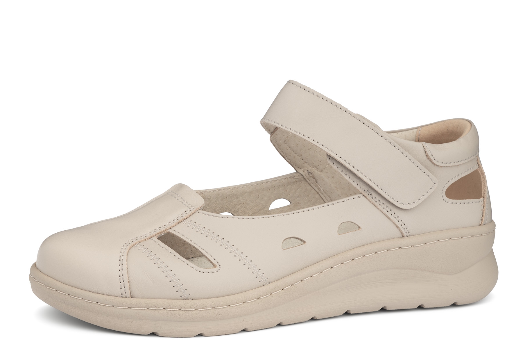 Bailar Pilar wygodne półbuty damskie wykonane ze skóry naturalnej - licowej w kolorze beżowym ; profilowane, amortyzujące wkładki z pianki pokryte tkaniną; lekkie, elastyczne podeszwy; tęgość K - stopy szerokie. Mogą być również na tęgość H dzięki regulacji podwójnymi wkładkami, które są w zestawie.
