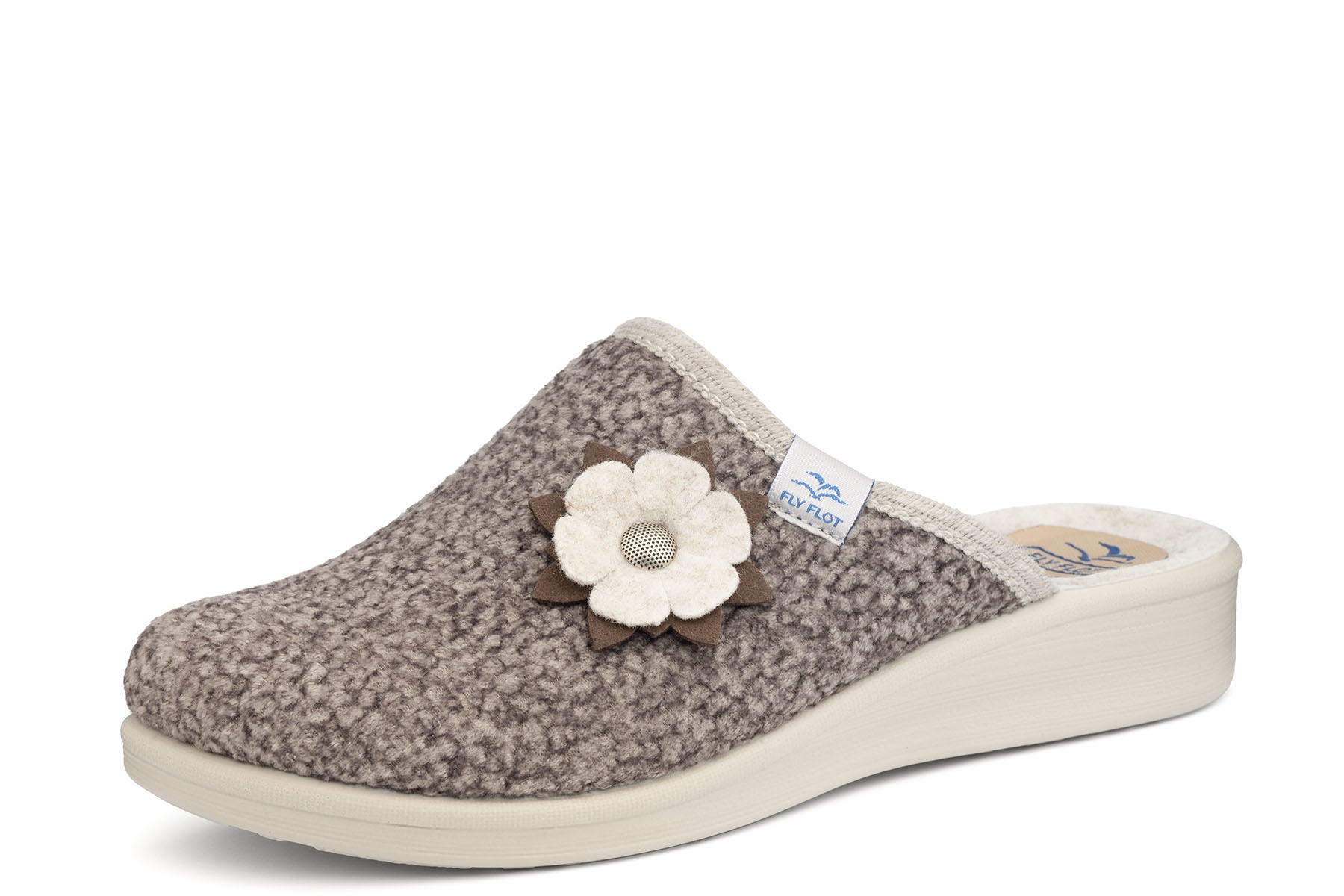 Fly Flot 83 W32 W32 TAUPE wygodne, zdrowotne damskie kapcie wykonane z miękkiej tkaniny; anatomicznie wyprofilowane wkładki; elastyczne, antypoślizgowe podeszwy; tęgość H - polecane na stopy szersze.