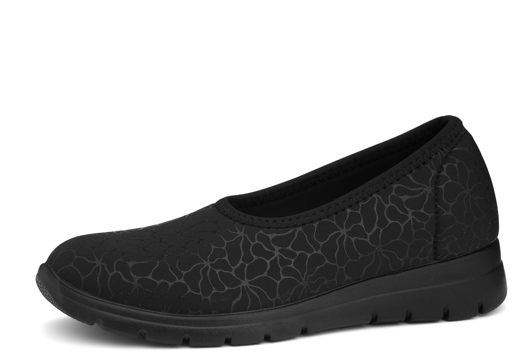 Sanital Flex SC143.13 BLACK wygodne półbuty damskie wykonane z elastycznej tkaniny; lekkie, amortyzujące podeszwy; wyjmowane wkładki; dzięki stretchowej tkaninie pasują na stopy z haluksami, palcami młoteczkowatymi; tęgość H - na stopy szersze. Polecane dla cukrzyków.