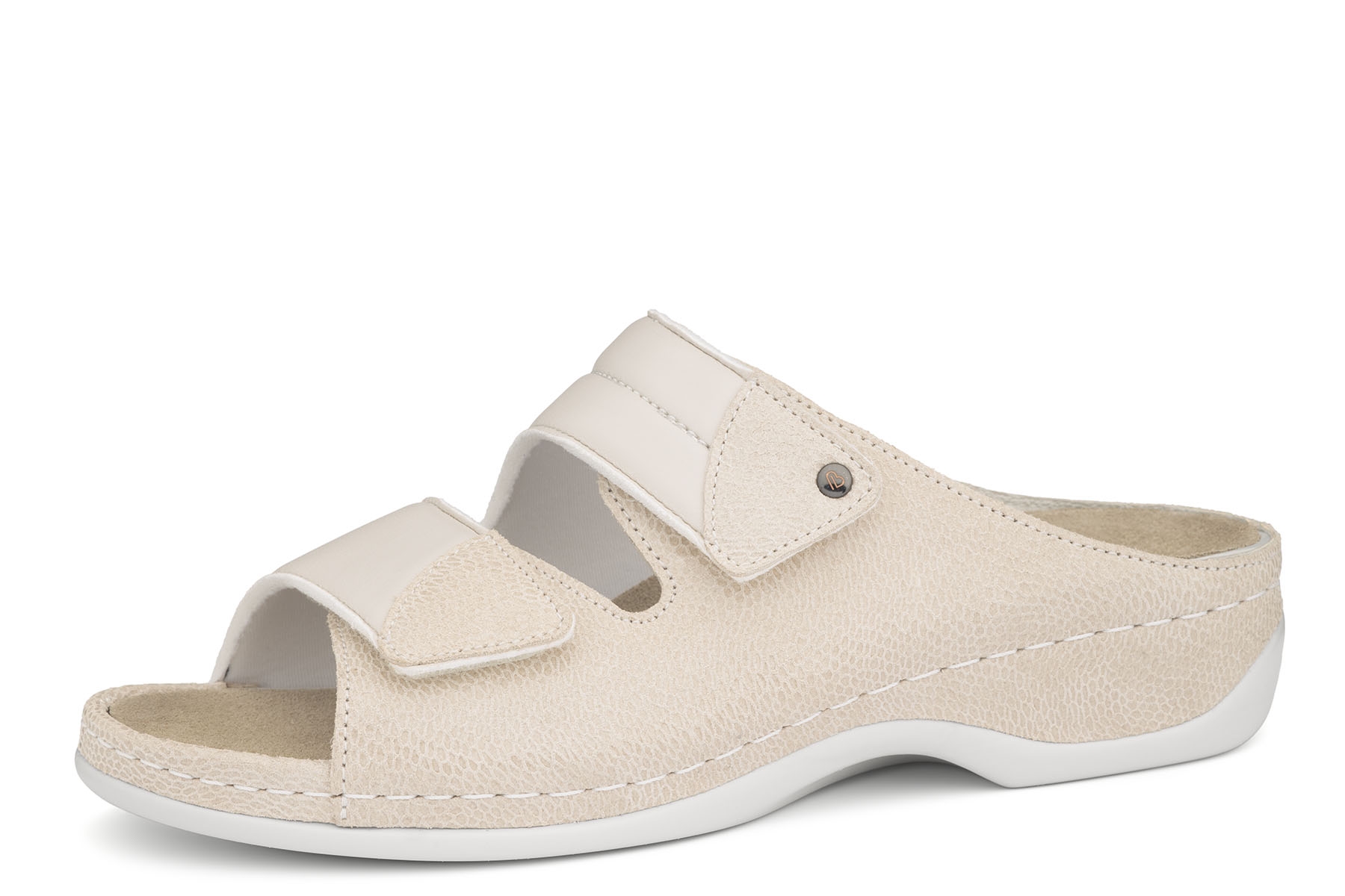 Berkemann Finja 01021 - 737 wygodne, zdrowotne klapki wykonane z wysokiej jakości materiałów; wierzch - skóra naturalna - lakierowana oraz specjalna elastyczna wstawka na haluksy; regulacja paskami na rzep; wymienne skórzane 5 - fazowe wkładki ortopedyczne profilowane na płaskostopie podłużne i poprzeczne ( można zastąpić własnymi ); elastyczne, amortyzujące podeszwy; tęgość H - polecane na stopy szerokie oraz dzięki regulacji pasują również na tęgość K - stopy bardzo szerokie.