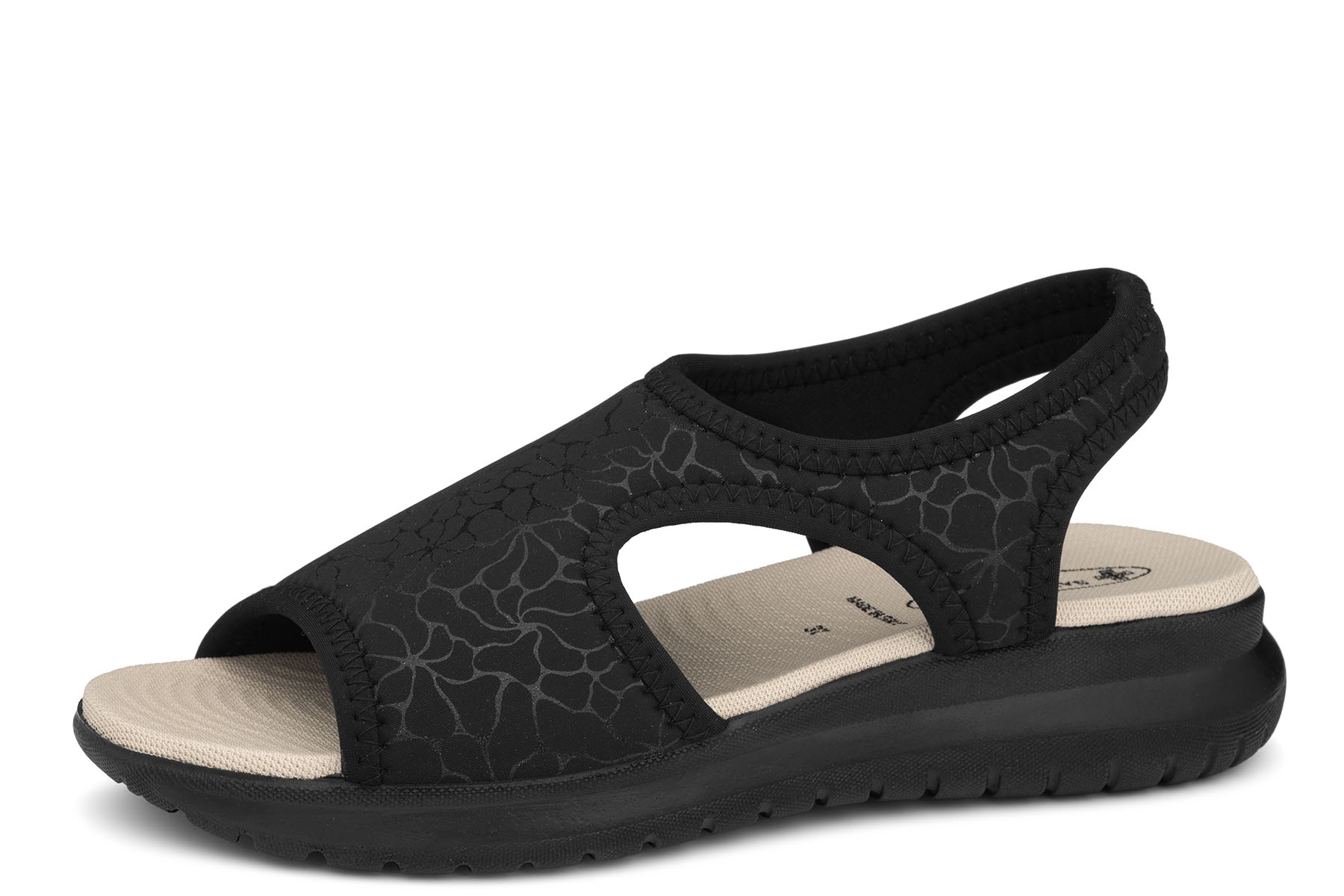 Sanital Flex 633.99 black wygodne tekstylne sandały damskie wykonane z miękkich, elastycznych materiałów w kolorze czarnym; miękkie, anatomicznie wyprofilowane wkładki; elastyczne, antypoślizgowe podeszwy; tęgość H - na stopy szersze.