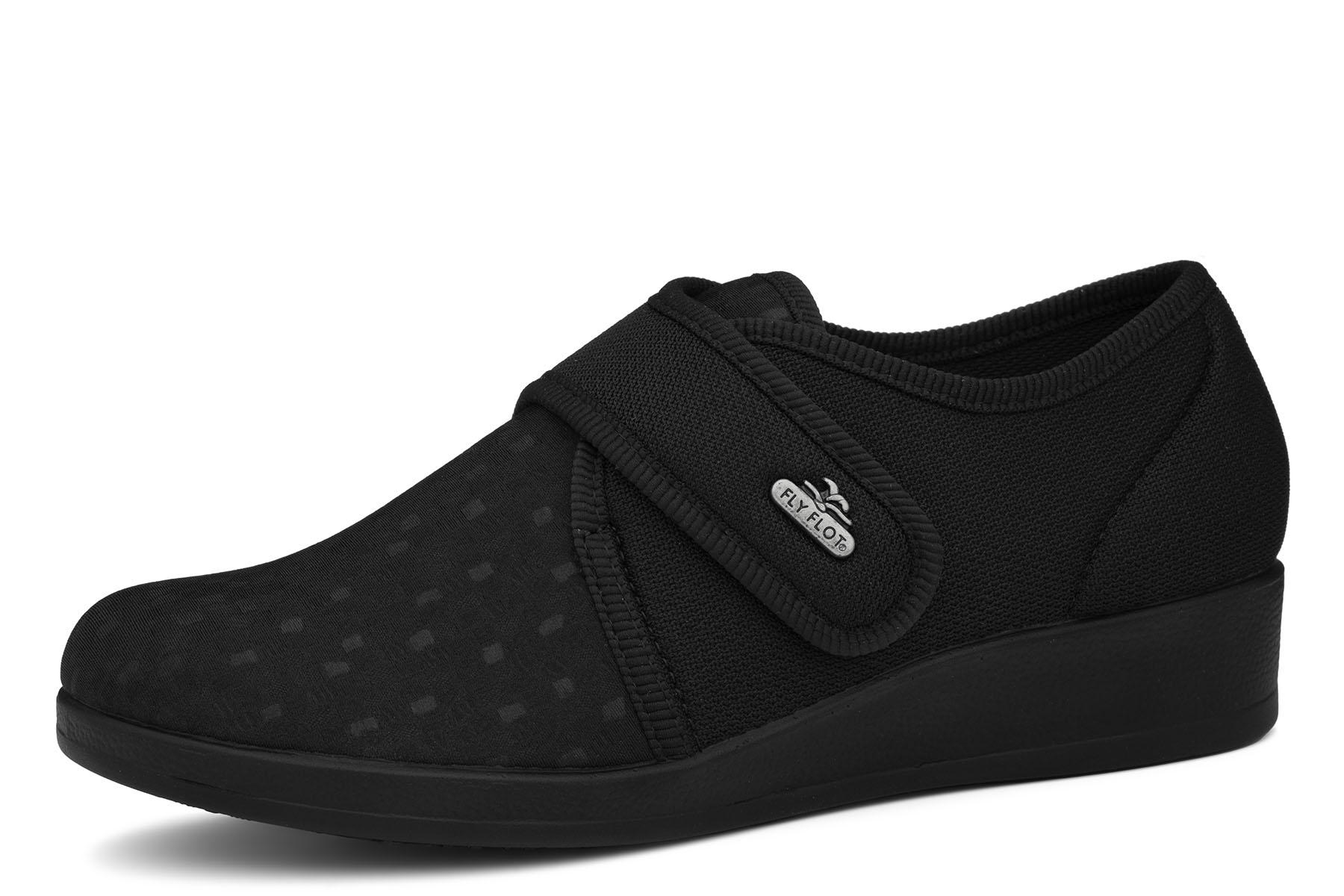 Fly Flot Q3 491 5X wygodne półbuty damskie wykonane z miękkiej tkaniny w kolorze czarnym; w miejscu haluksów elastyczny materiał; lekkie podeszwy; tęgość H - polecane na stopy szersze.