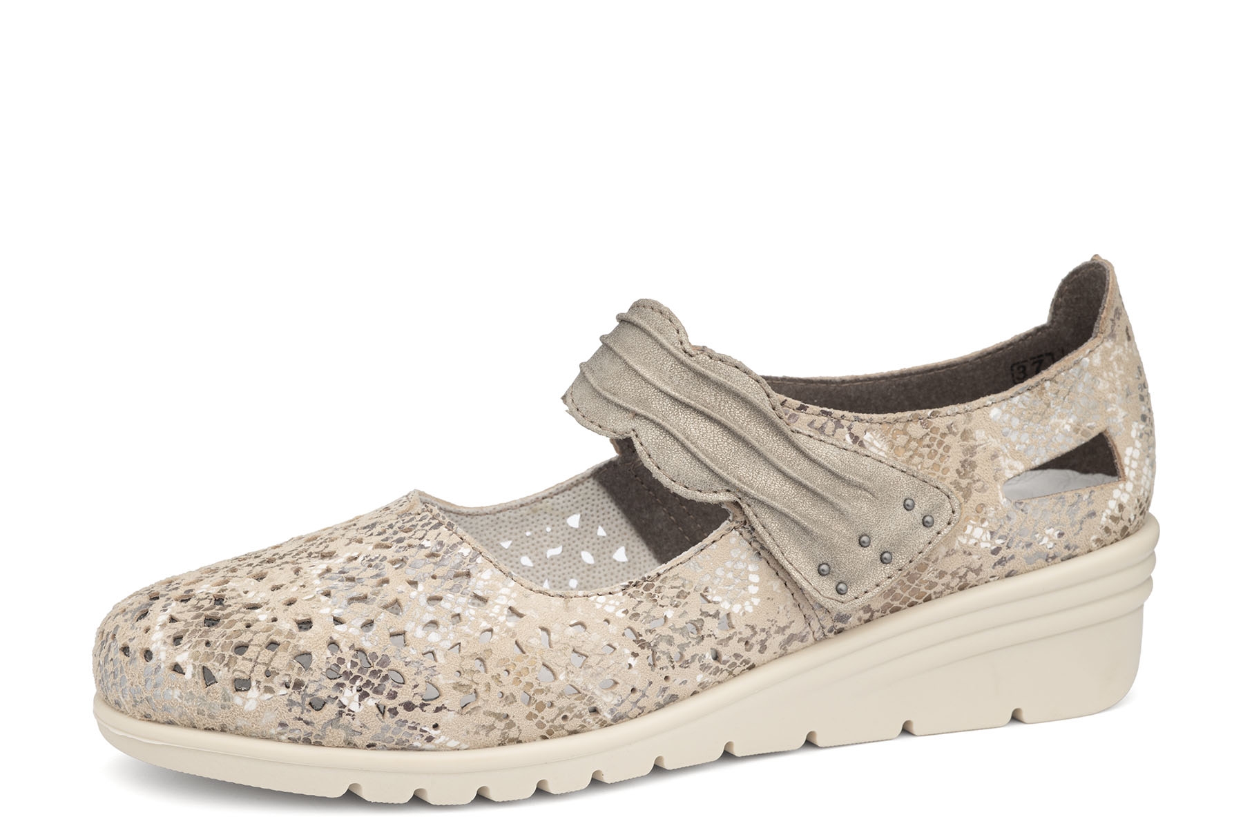 Rieker wzór L5359-90 wygodne półbuty damskie wykonane ze skóry naturalnej; skórzane wkładki z masującymi wypustkami; regulacja paskiem na rzep; elastyczne, antypoślizgowe podeszwy; polecane na stopy średnio - szerokie.
