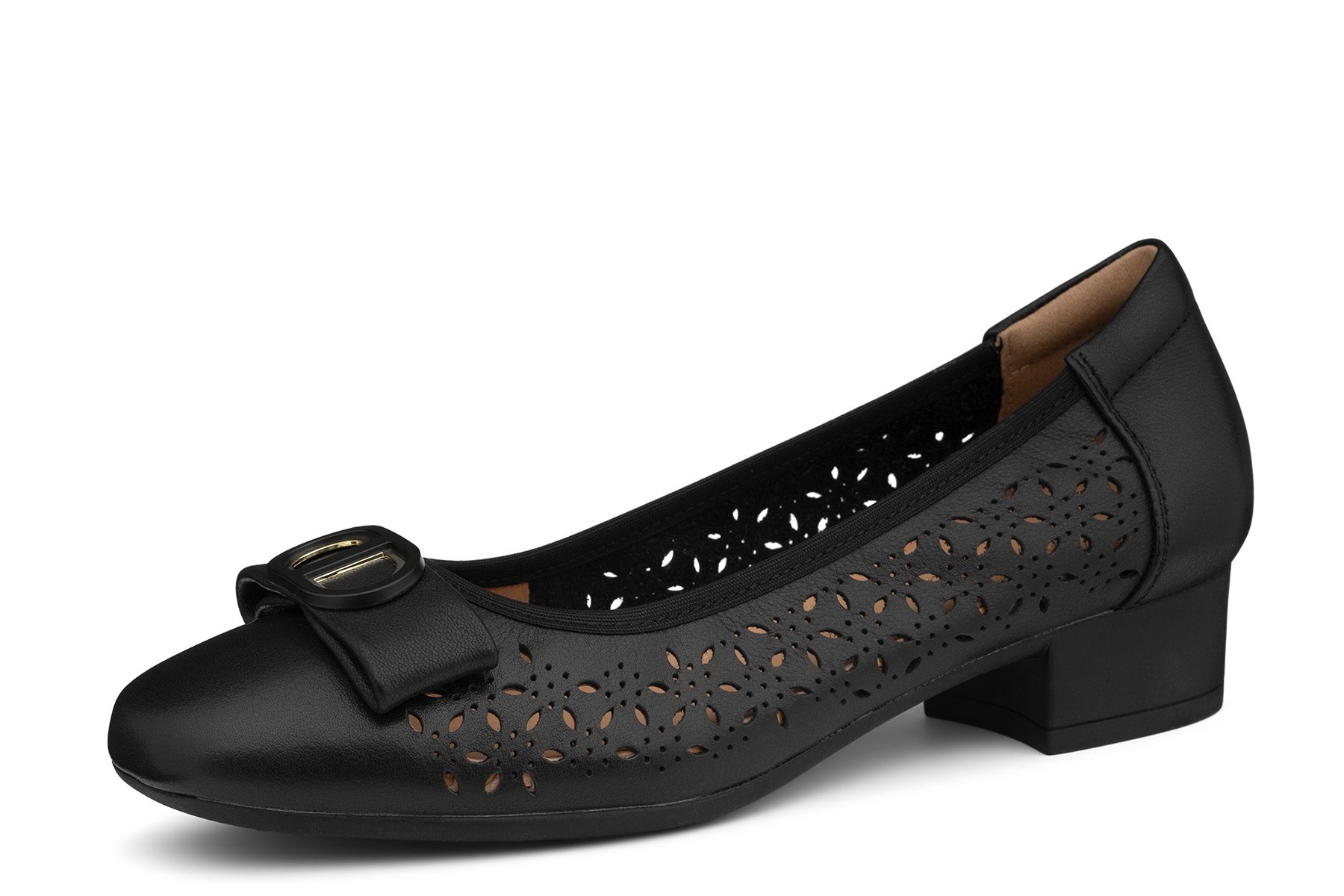 Loretta Vitale W5338 black wygodne damskie czółenka wykonane z perforowanej skóry naturalnej; miękkie skórzane wkładki; elastyczne, antypoślizgowe podeszwy, stabilne obcasy; tęgość G/H - na stopy średnio - szerokie.