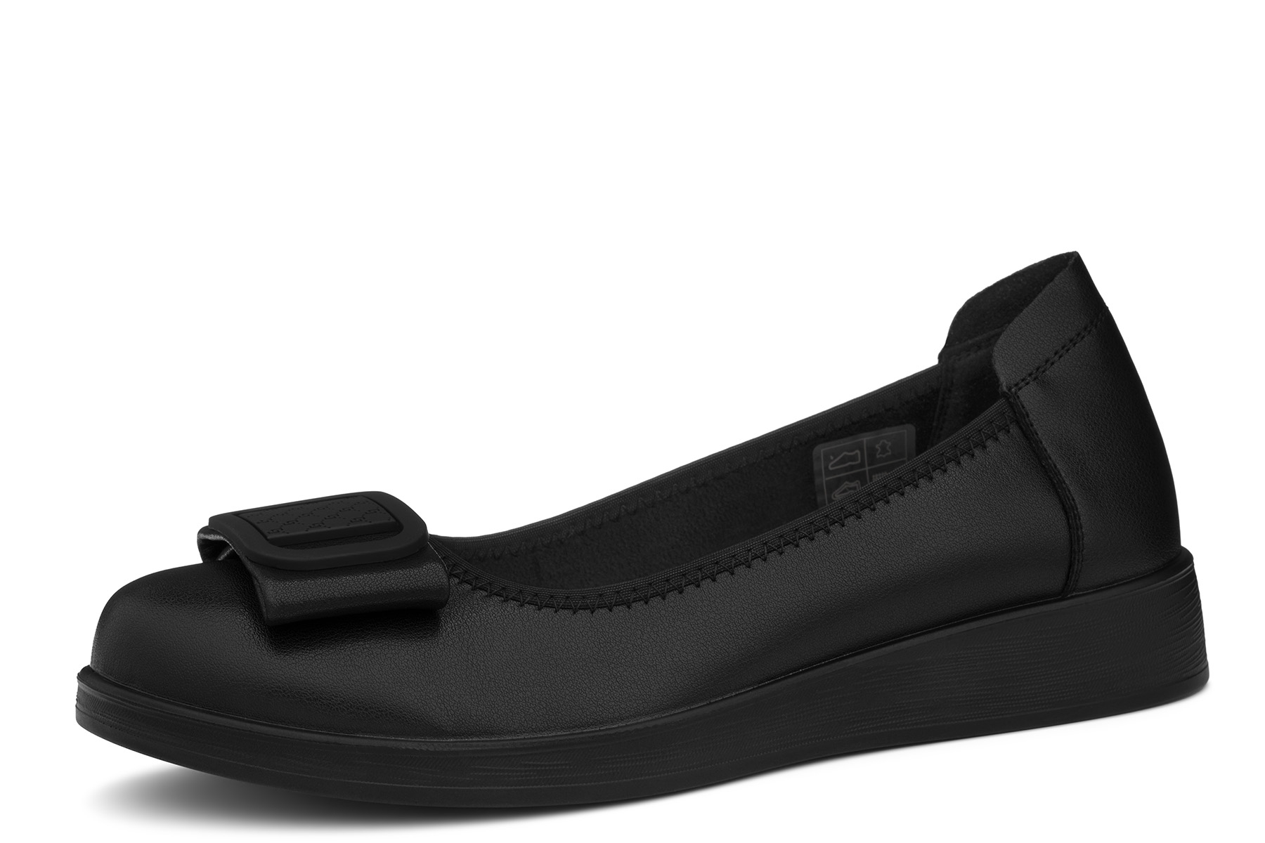 Loretta Vitale W9957A wygodne damskie baleriny wykonane z miękkiej skóry licowej w kolorze czarnym; przyjemna w dotyku futrówka z tkaniny; amortyzujące skórzane wkładki; grubsze, antypoślizgowe, elastyczne podeszwy; z oznaczeniem tęgości H - stopy szersze, jednak dzięki mocno elastycznej lamówce przy podbiciu mogą być na tęgość K - stopy bardzo szerokie.