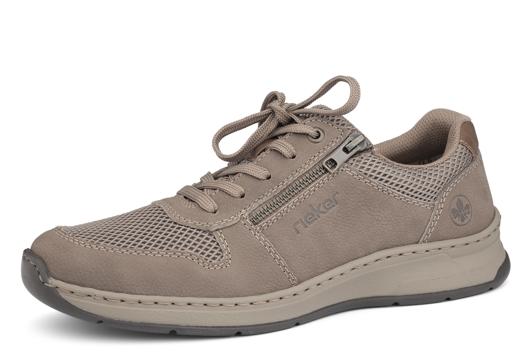 Rieker 14300-64 wygodne męskie półbuty wykonane z połączenia skóry naturalnej i tkaniny; wyjmowane, piankowe wkładki pokryte tkaniną; suwak ułatwiający zakładanie; lekkie, elastyczne, antypoślizgowe podeszwy; Extra Weit - polecane na stopy szersze.