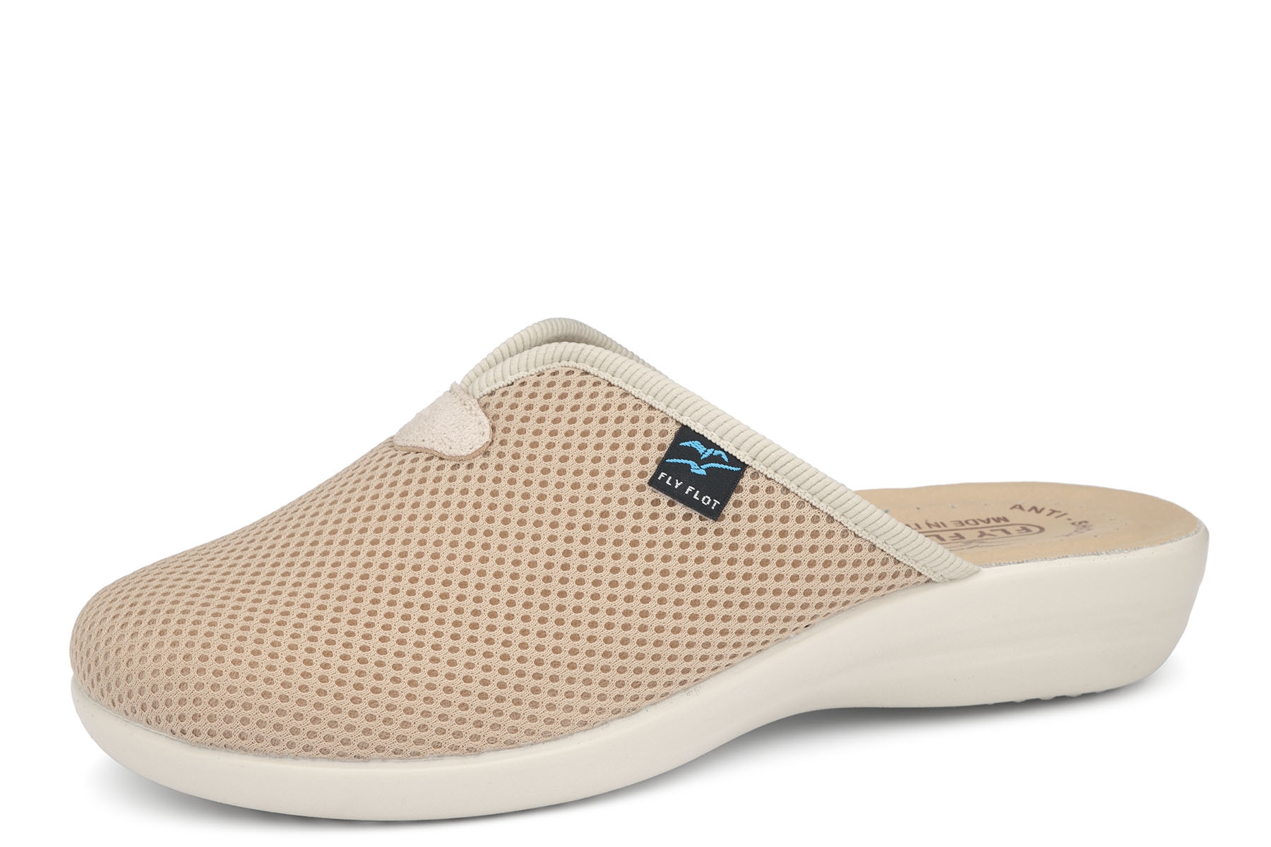 Fly Flot wzór P3 Y64 FE BEIGE wygodne klapki damskie wykonane z elastycznej, przewiewnej tkaniny; miękkie skórzane wkładki anatomicznie wyprofilowane; lekkie, elastyczne, antypoślizgowe podeszwy; tęgość H - na stopy szersze.