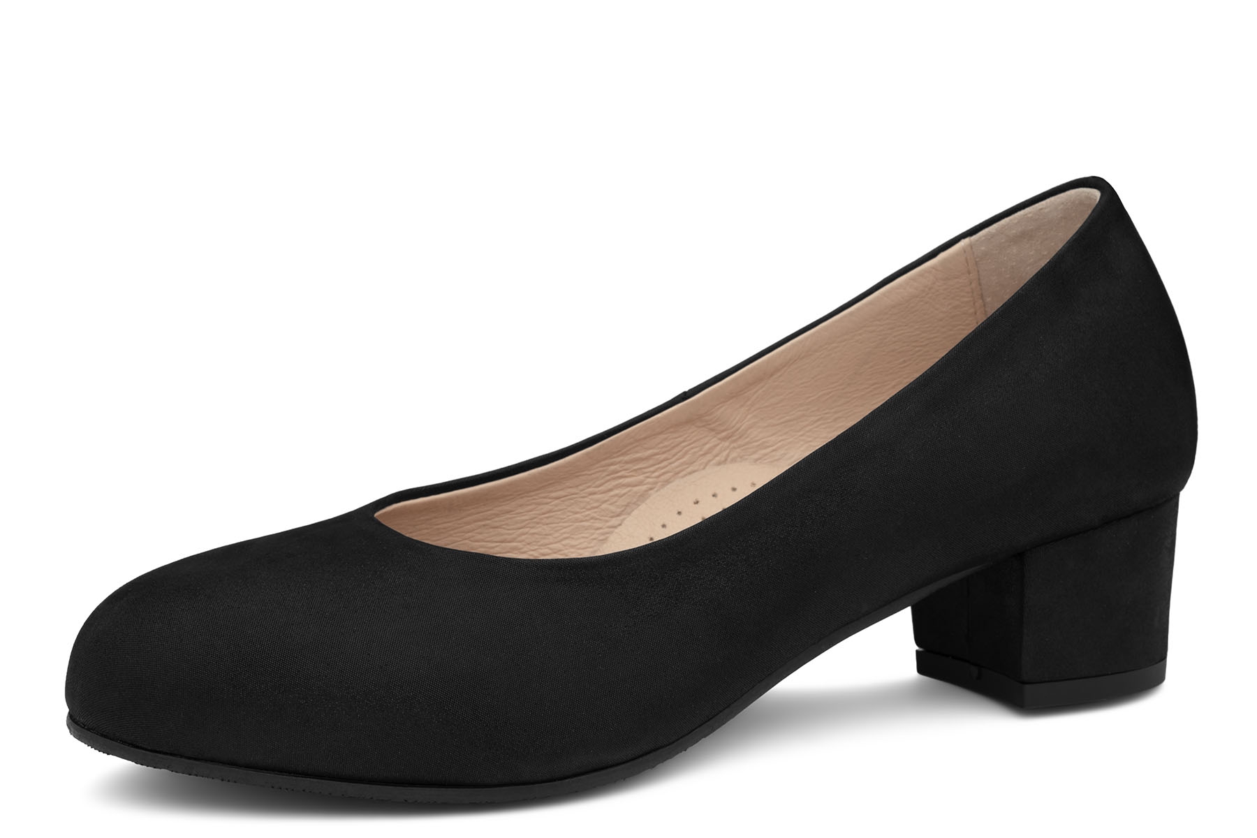 Bailar K-Ines wygodne czółenka damskie wykonane z miękkiej satynowej skóry naturalnej w kolorze czarnym; profilowane, amortyzujące wkładki z pianki pokryte skórą; elastyczne, antypoślizgowe podeszwy; stabilne obcasy; tęgość K - na stopy szerokie, dzięki zastosowaniu miękkich skór mogą być również na tęgość M - stopy bardzo szerokie.
